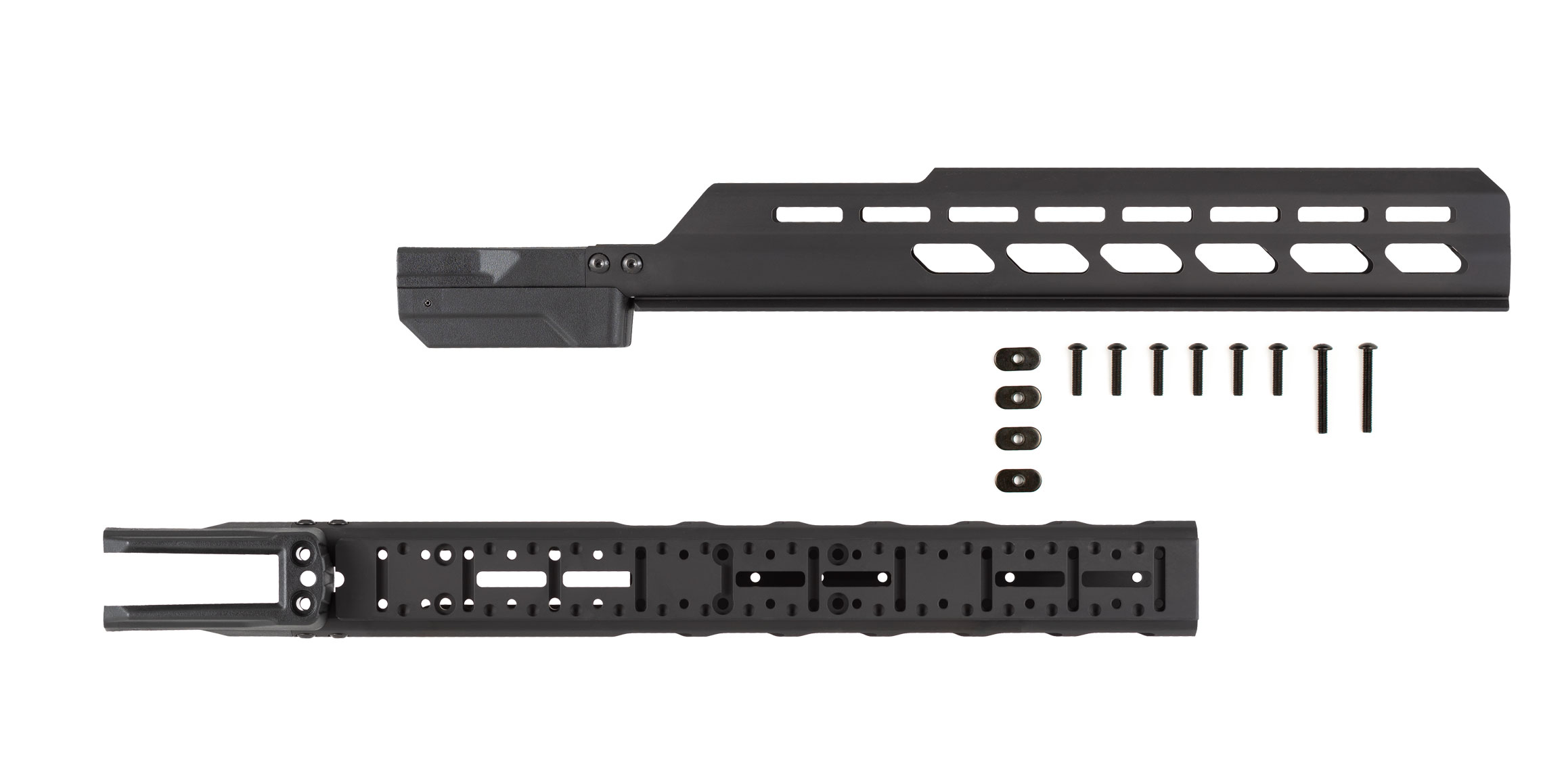 The ARCA Rail Enclosed Forend XL is 2 inches longer that our other Enclosed Forends offering plenty of real estate for bipods, weights, and other attachments. It includes an integrated ARCA rail and uninterrupted rows of M-Lok on either side to meet your mounting needs. For those who require a Picatinny rail at the 12 o’clock, the ARCA Rail Enclosed Forend XL accepts C-4 Shroud Rails (available separately). The bottom of the ARCA rail is compatible with the KRG Δ-Lug & RRS-Lock systems and works with standard ARCA clamps as well.
