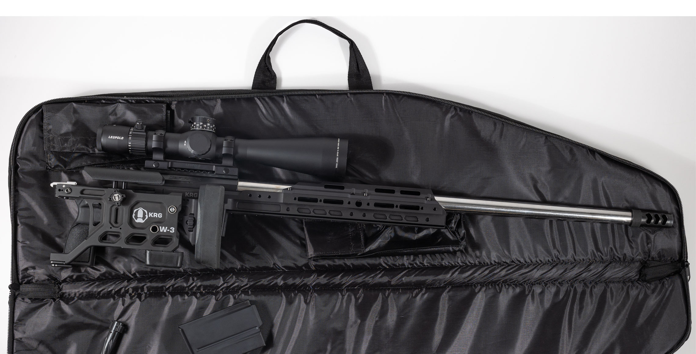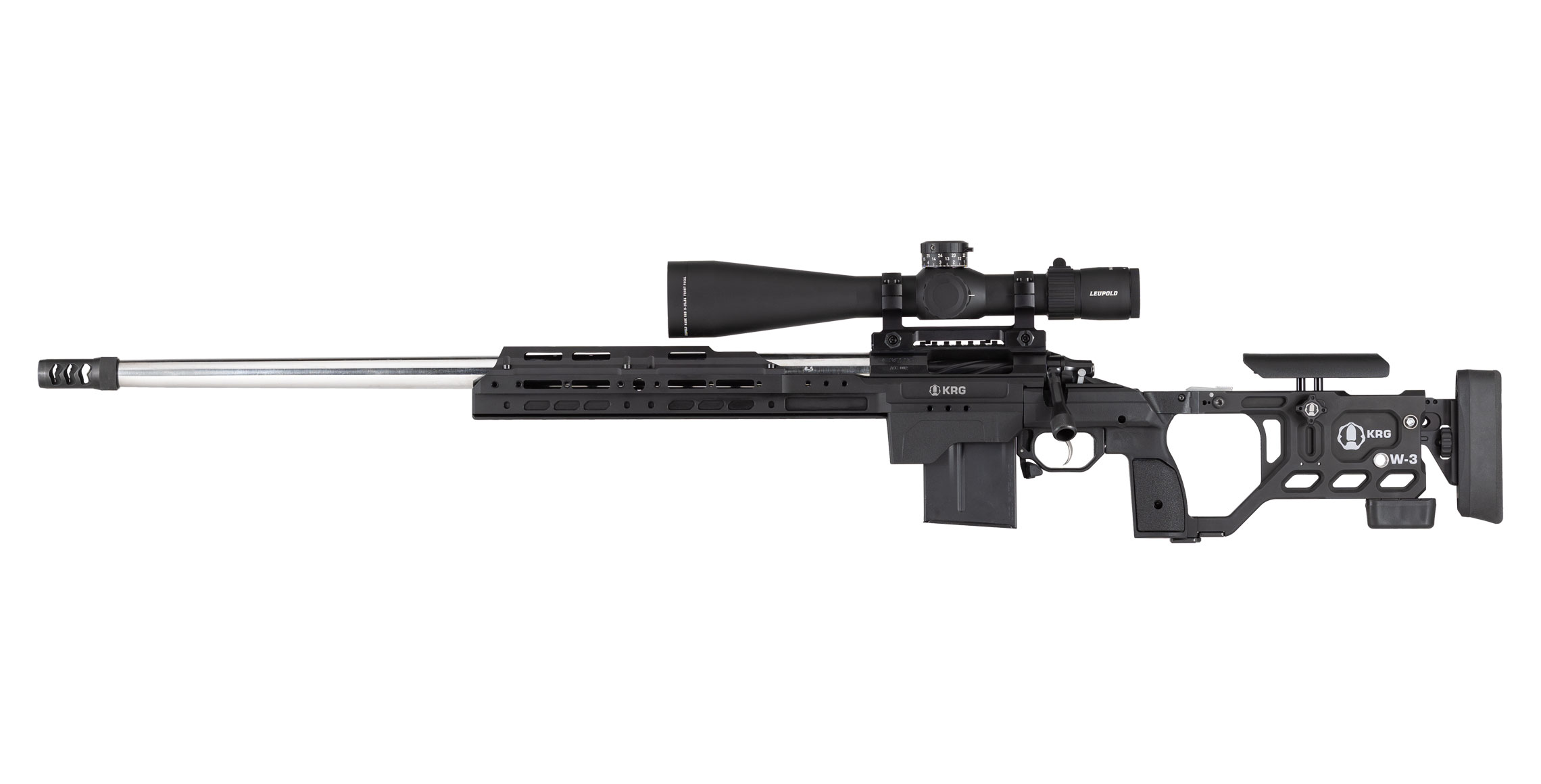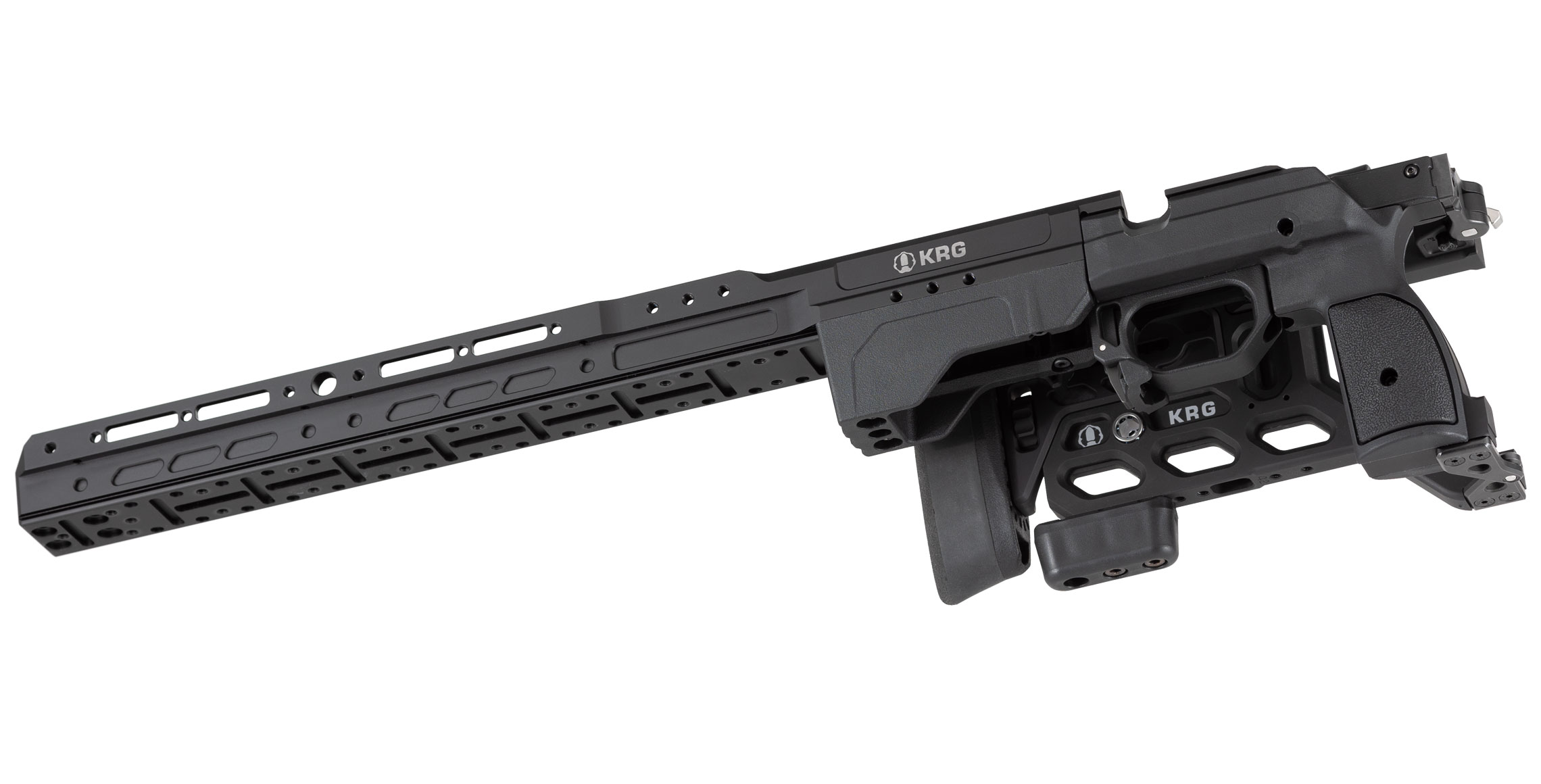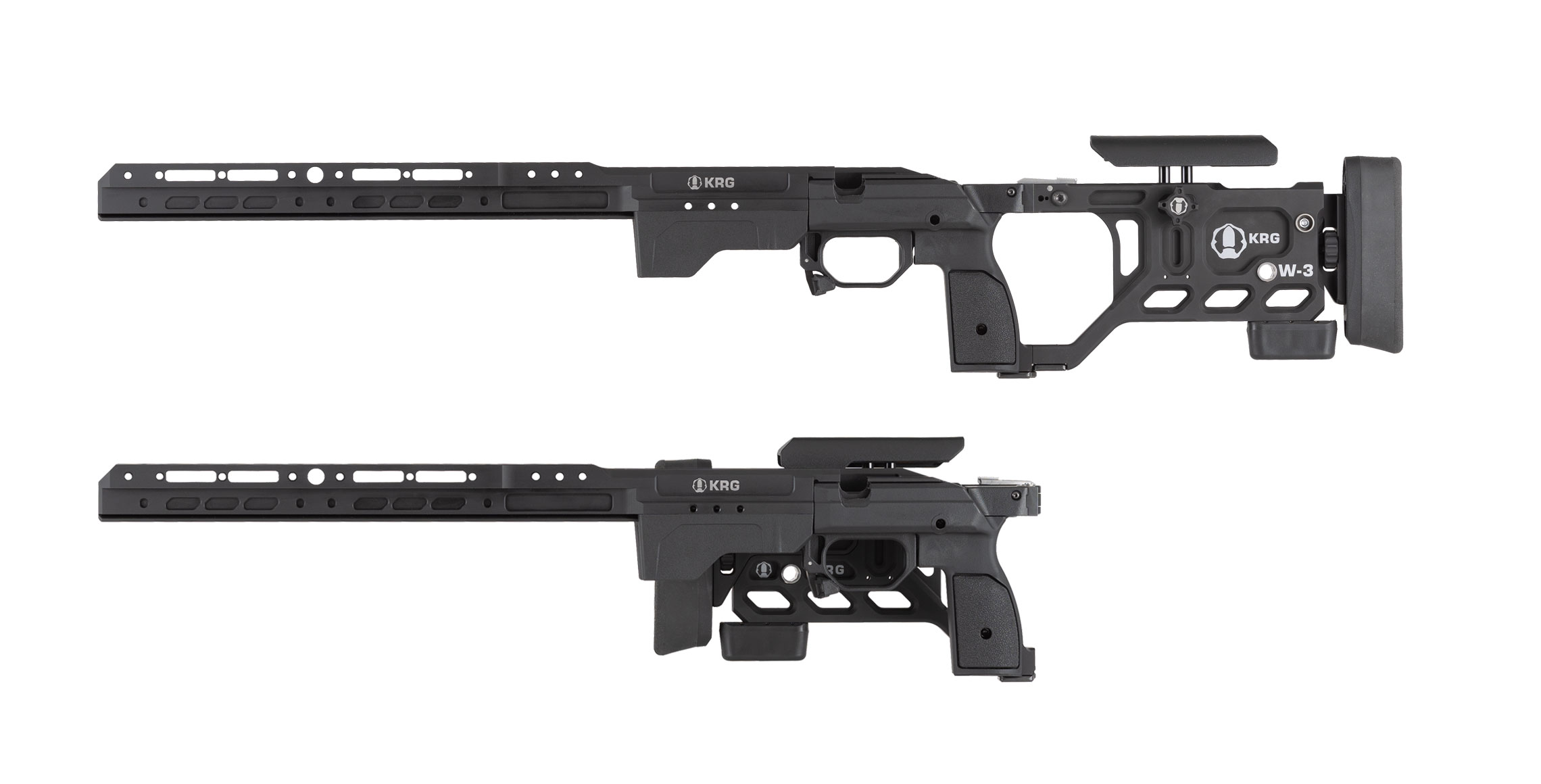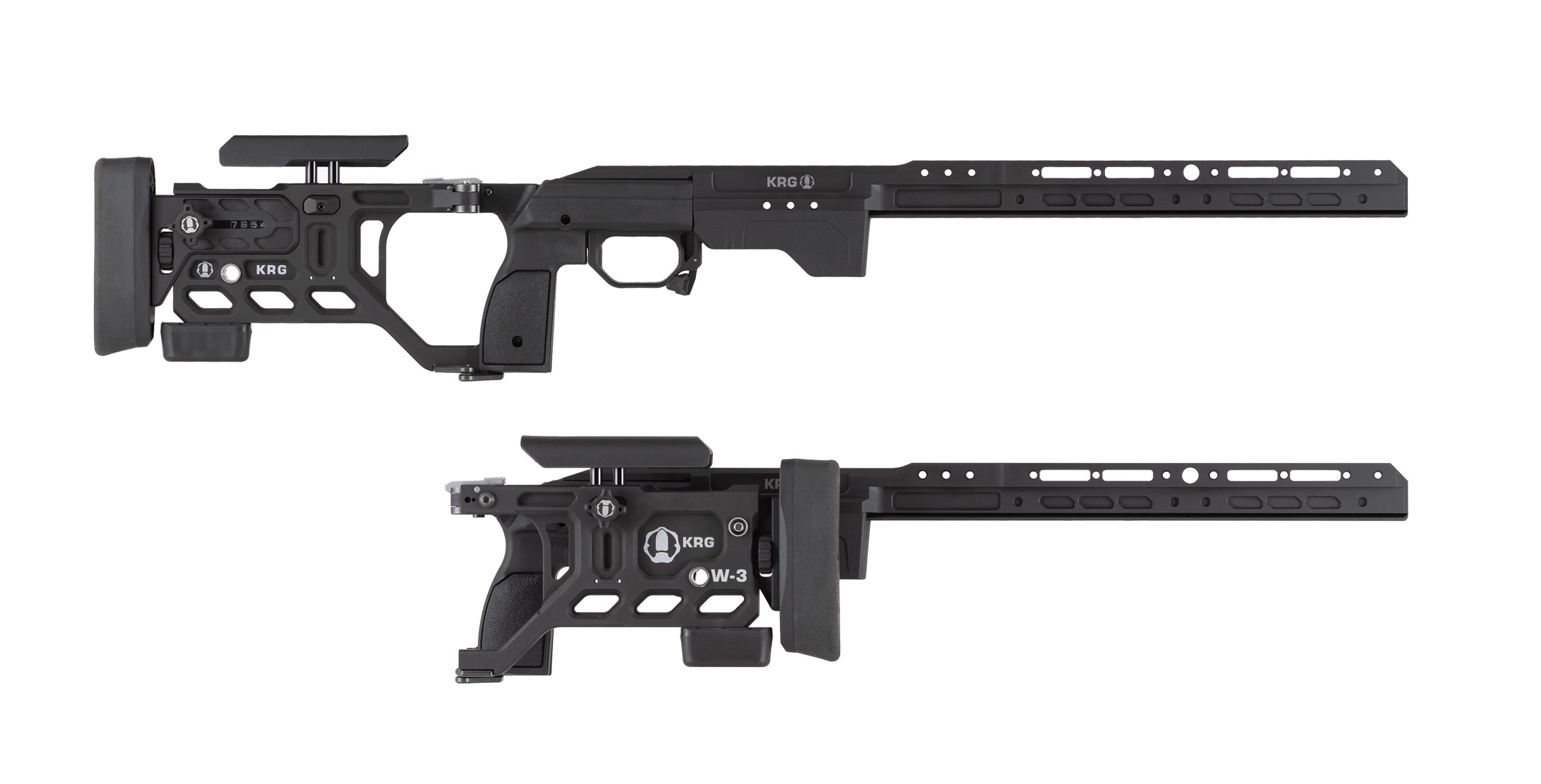 Introducing the KRG Whiskey-3 Pro Lefty chassis system. Combining elements of the Whiskey-3 and C-4 into one platform with the features many have been asking for. The new monolithic aluminum front end combines our traditional backbone with an extended forend featuring an integrated ARCA rail on the bottom and M-Lok mounting points at the 3, 6, & 9 o’clock positions. The back end features an all new cheekpiece with fore & aft as well as side to side adjustment. The folding version can be user configured to fold to the left or the right.