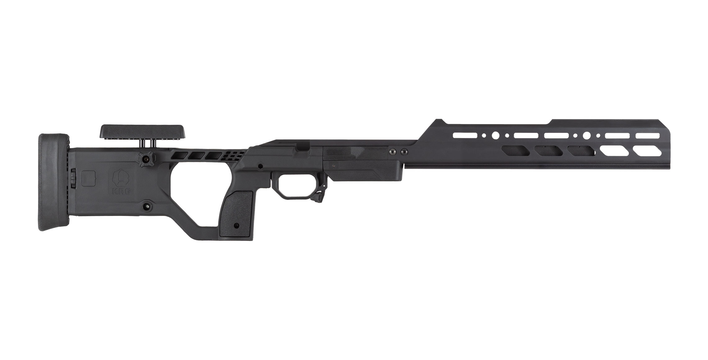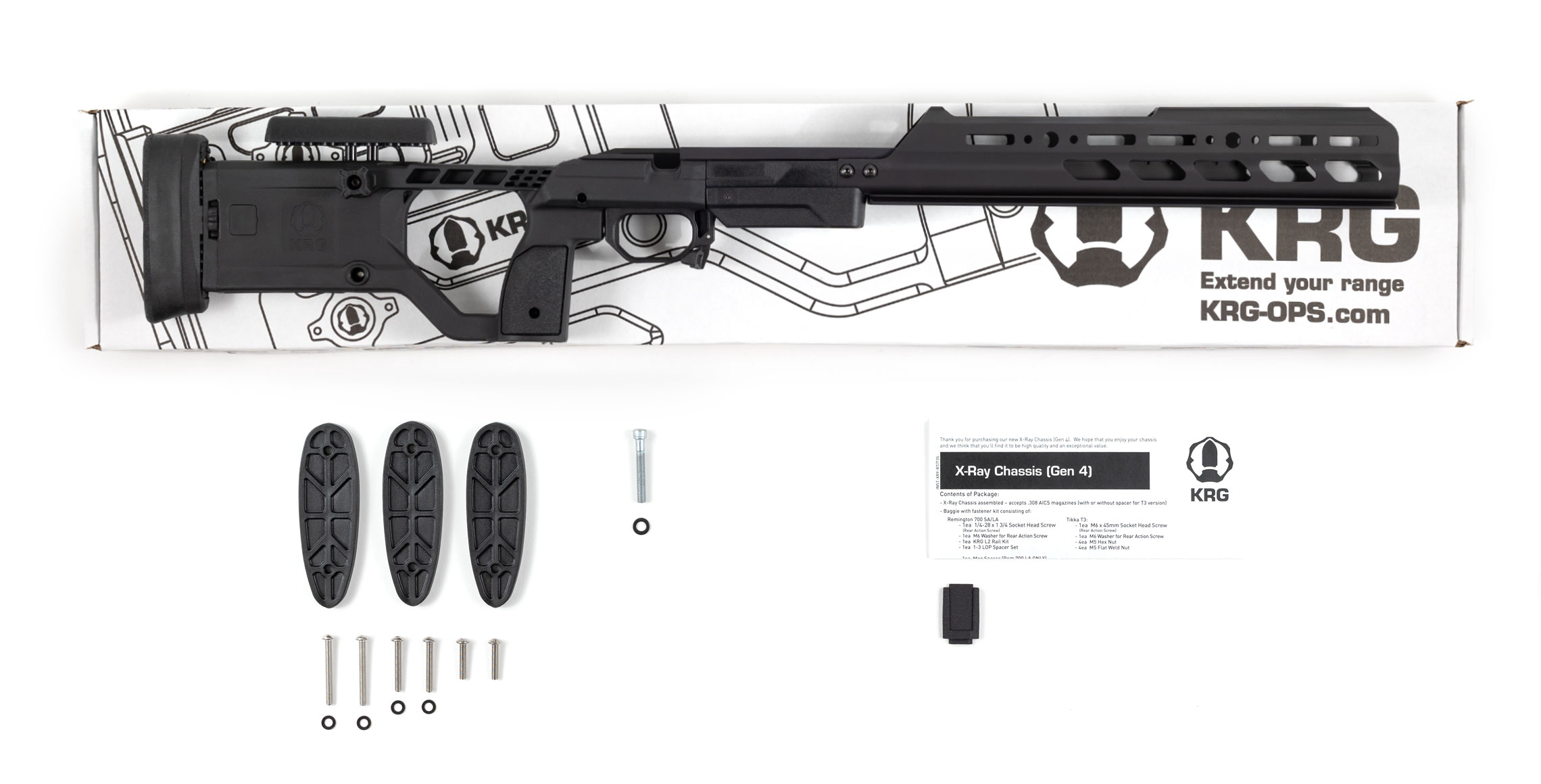 X-Ray Chassis in Stealth Grey on Remington 700 Long Action; Optional KRG accessories shown are Polymer Flat Bag Rider, LOP Spacer Set and .300WM 5rd KRG logo magazine